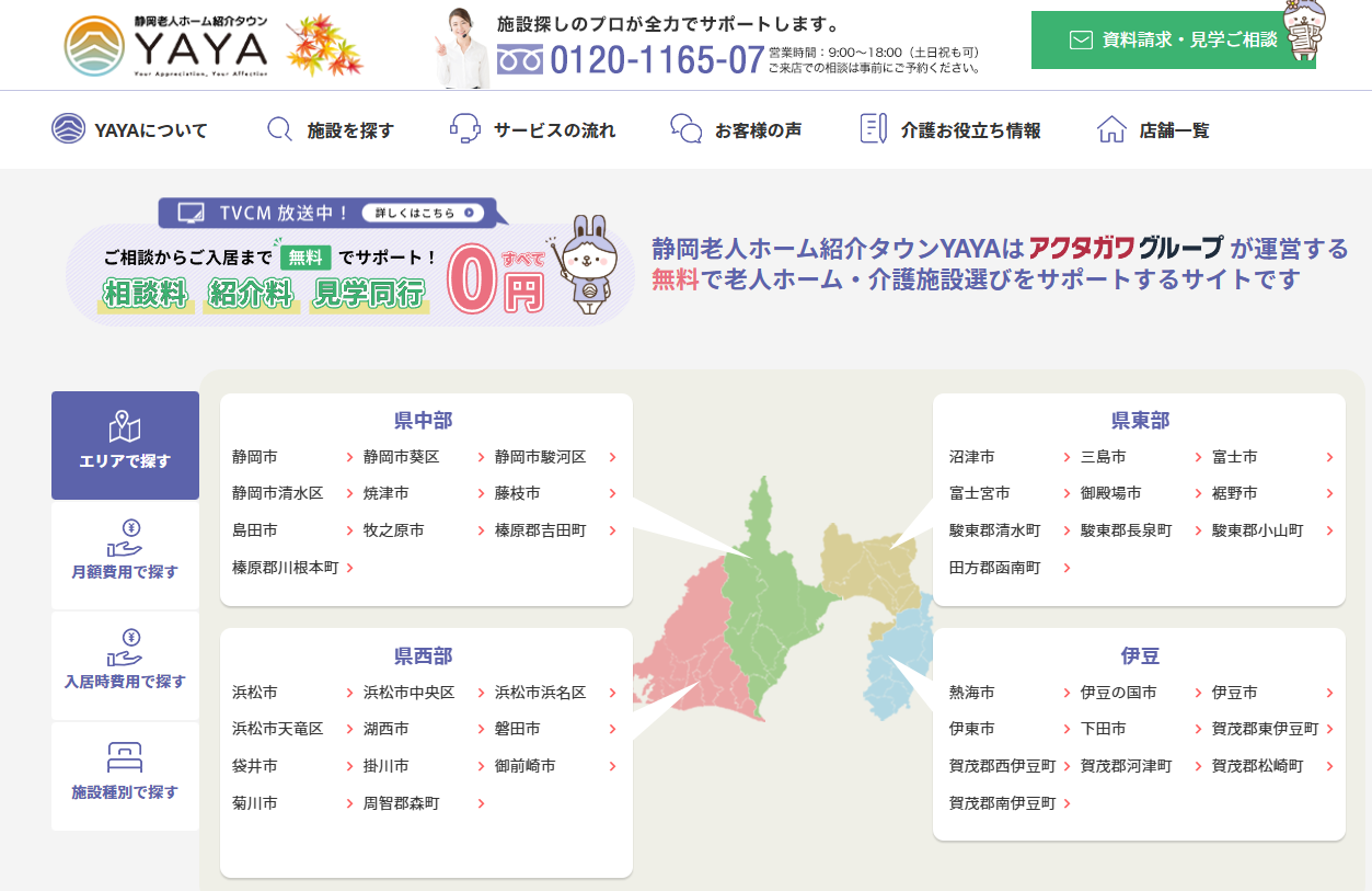 「静岡老人ホーム紹介タウンYAYA」は静岡県内で25年以上の老人ホーム運営実績があるアクタガワグループが運営しております。アクタガワグループの介護専門相談員が豊富な経験をもとに無料で老人ホーム探しからご入居まで、親身にサポートいたします。TVCM放送中です。